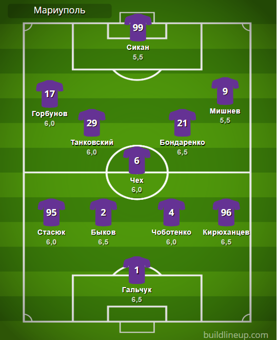 «Мариуполь»: Гальчук – Стасюк, Быков, Чоботенко, Кирюханцев – Чех – Горбунов (Очеретько, 64), Танковский (Кулиев, 86), Бондаренко, Мишнев – Сикан (Кулаков, 66).