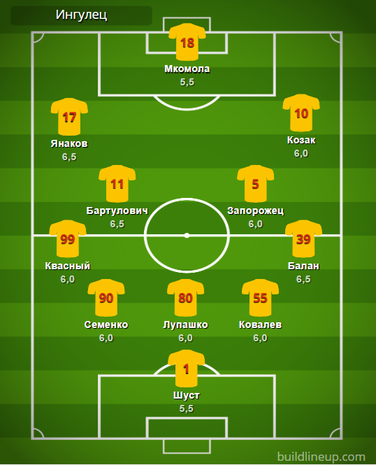 «Ингулец»: Шуст – Квасный, Семенко, Лупашко, Ковалев, Балан – Янаков (Белоцерковец, 80), Бартулович (Литвяк, 80), Запорожец, Козак (Коваленко, 76) – Мкомола (Плохотнюк, 71).