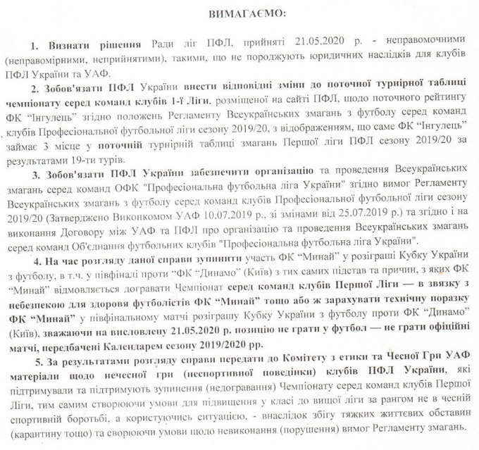 ФК Ингулец «Ингулец» обратился в КДК и исполкома УАФ с требованием признать недействительными решения Совета лиг от 21 мая. Согласно решениям этого заседания соревнования в Первой и Второй лиге были досрочно остановлены. Напомним, 5 июня 2020 года состоится заседания Совета лиг без представителей Второй лиги, на котором будет принято окончательное решение, касательно регламента соревнований. «Ингулец» выступает против этого. Также клуб требует приостановить участие «Миная» в Кубке Украины на время рассмотрения дела по доигрыванию Первой лиги или засчитать техническое поражение закарпатцам в противостоянием с киевским «Динамо». ![]()